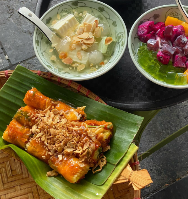 Proprio accanto a questo banco, troverai anche altri due snack che i locali spesso mangiano insieme agli spiedini. Il bánh tráng trộn è uno snack di carta di riso mixata con manzo essiccato, uova di quaglia, erbe, arachidi e una salsa aspra e saporita. Il chè khúc bạch è un dessert leggero e freddo fatto con gelatina di latte, solitamente servito con longan e mandorle, rinfrescante e non troppo dolce.