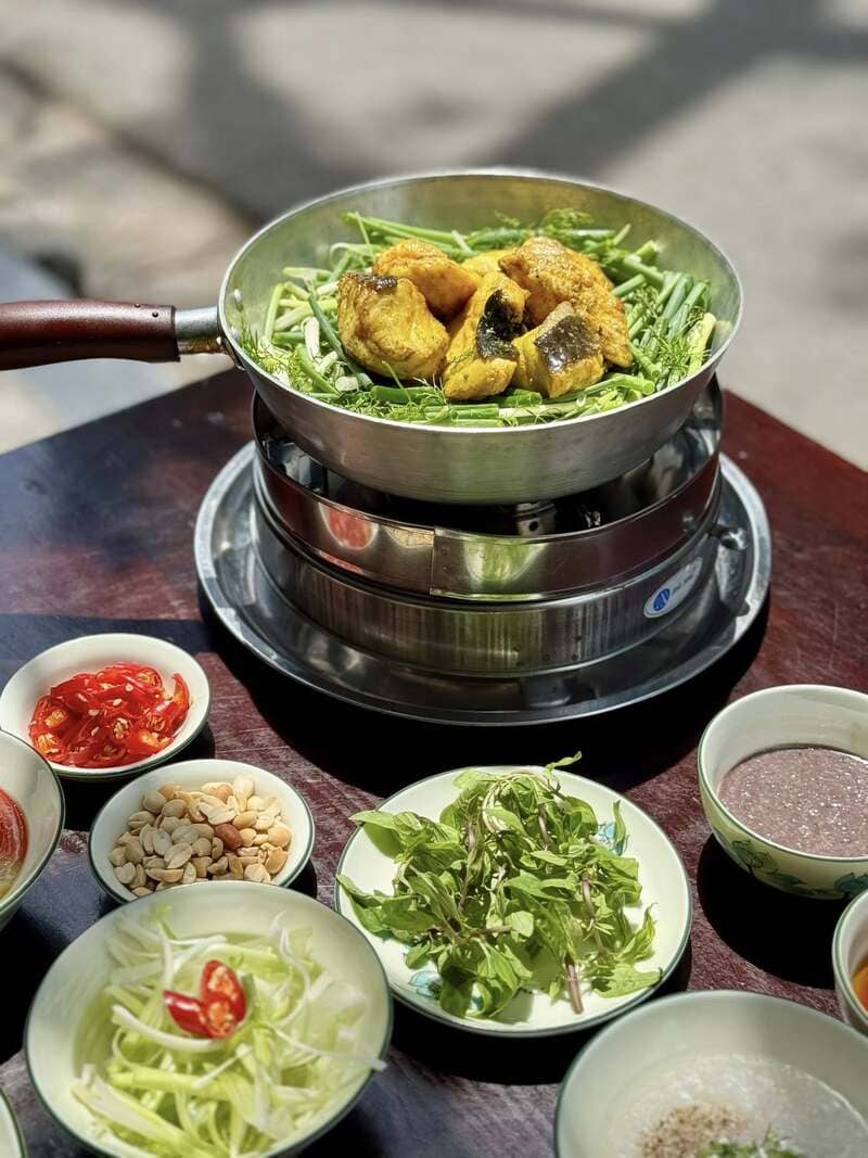 Quando la padella arriva al tavolo, è già calda. Il pesce è stato marinato con curcuma e spezie e, non appena tocca l'olio, il profumo riempie la stanza. Poi arrivano l'aneto e i cipollotti. Molto aneto. L'aroma è forte, quasi travolgente all'inizio, ma è esattamente così che deve profumare il chả cá.
