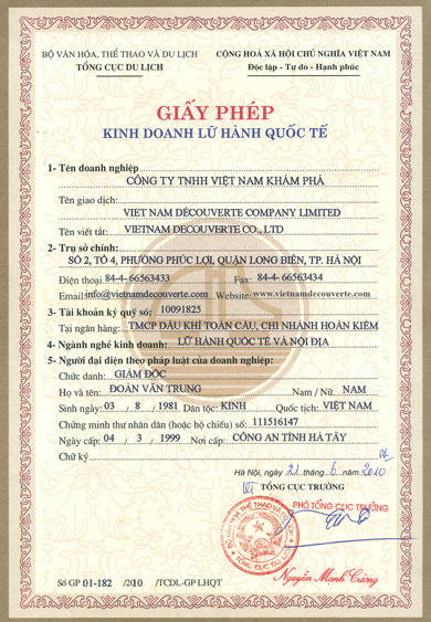 - La licenza di operatore turistico rilasciata dall'Amministrazione Nazionale del Turismo Vietnamita (l'agenzia governativa responsabile della supervisione degli operatori turistici nel Paese).