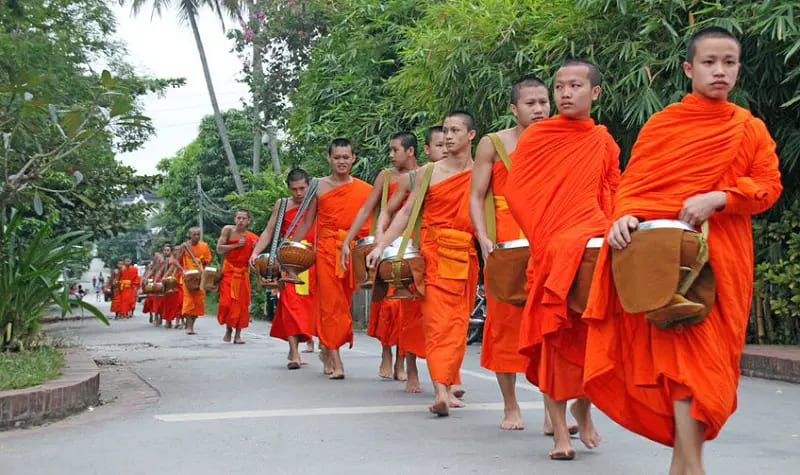 Sveglia all’alba per assistere al sacro rito della questua: oltre 200 monaci buddhisti raccolgono offerte di cibo lungo le strade.