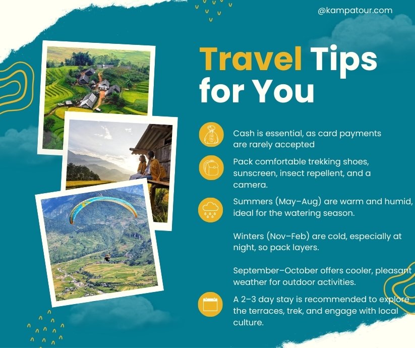 All'inizio dell'autunno, i campi diventano di un affascinante giallo dorato, pronti per il raccolto. L'inverno porta superfici d'acqua scintillanti che somigliano a piscine naturali, e in primavera, le terrazze rivivono con i contadini che piantano un nuovo raccolto.