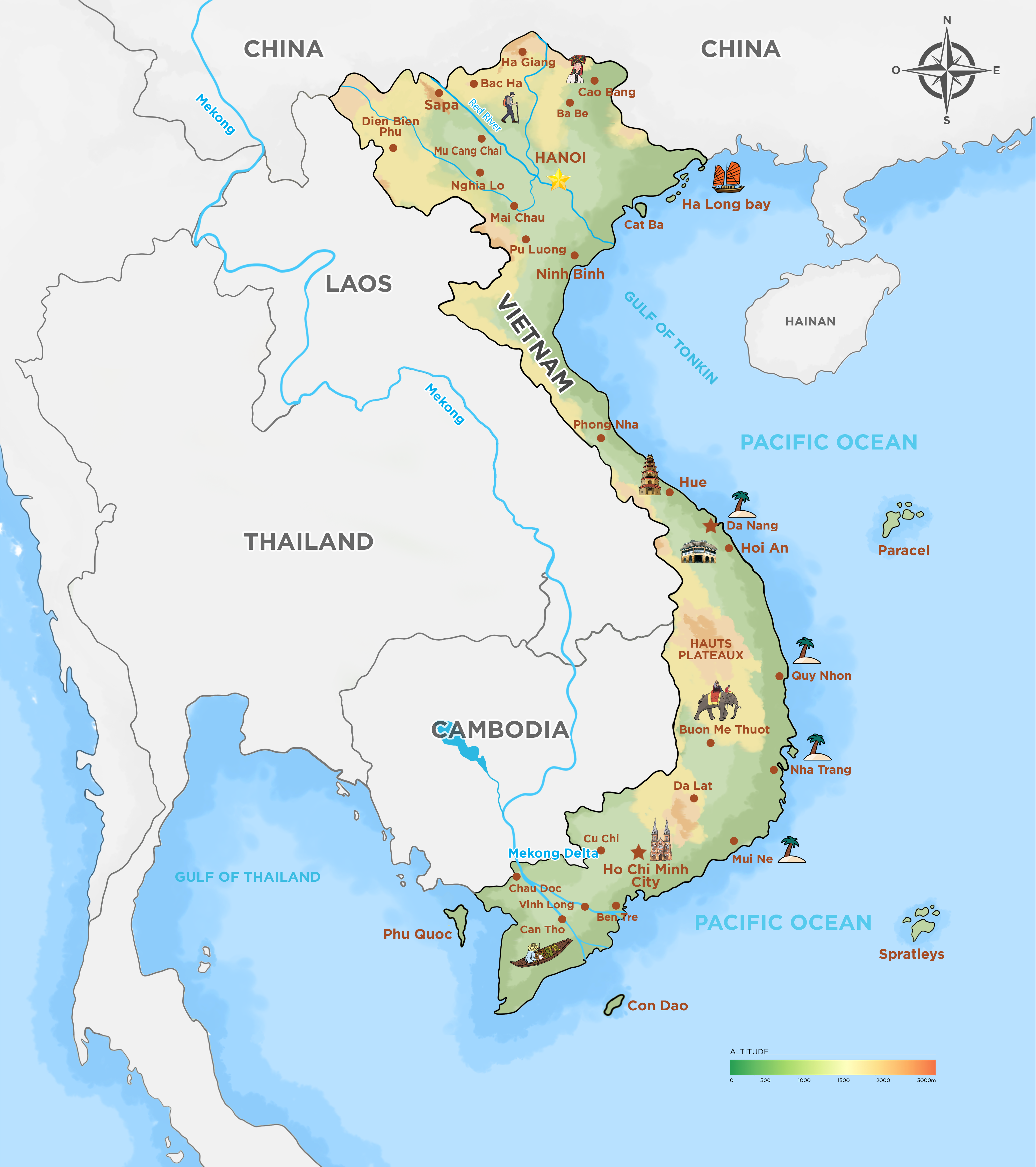Posizione Geografica: Situato nel Sud-est asiatico, confina a nord con la Cina, a ovest con il Laos e la Cambogia e a est con il Mar Cinese Meridionale (o Mare Orientale).