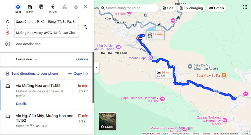 Il viaggio verso la valle di Muong Hoa inizia dalla città di Sapa. Dirigiti verso il Love Market, svolta su Cau May Street, poi prendi a sinistra all'incrocio su Muong Hoa Street. Segui la strada tortuosa (Strada Provinciale 152) per circa 10 km. Dopo aver passato il negozio Thuan Duyen, svolta a destra nella valle di Muong Hoa.